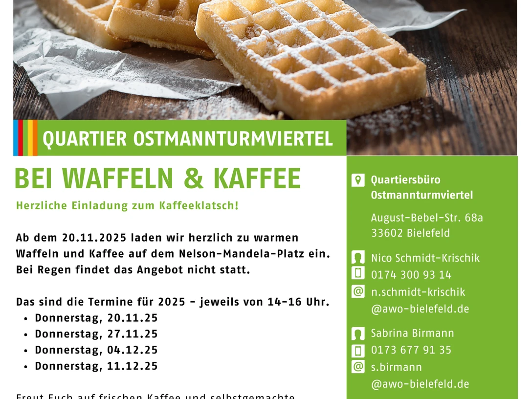 Herzliche Einladung zum Kaffeeklatsch! Ab dem 20.11.2025 laden wir herzlich zu warmen Waffeln und Kaffee auf dem Nelson-Mandela-Platz ein. Bei Regen findet das Angebot nicht statt.
