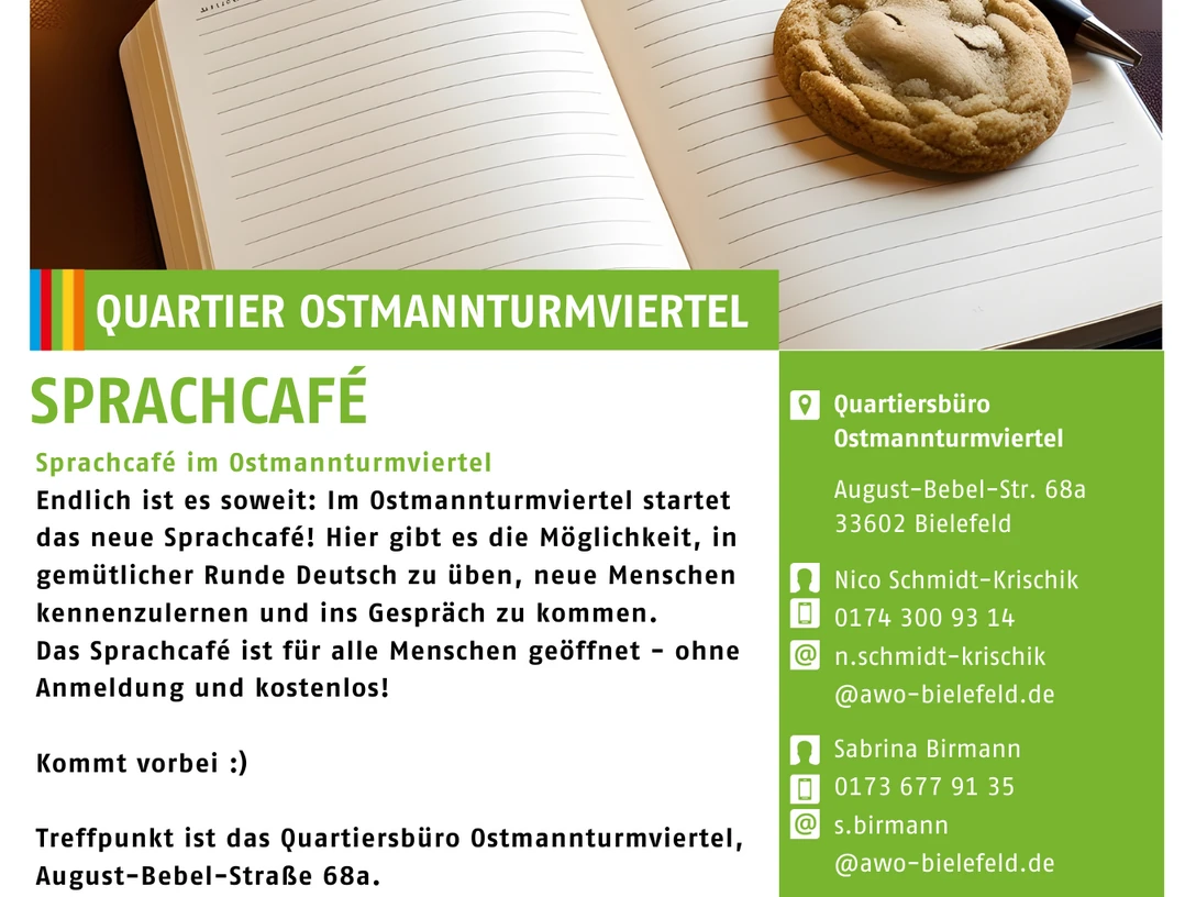 Endlich ist es soweit: Im Ostmannturmviertel startet das neue Sprachcafé. Hier gibt es die Möglichkeit, in gemütlicher Runde Deutsch zu üben, neue Menschen kennenzulernen und ins Gespräch zu kommen. Das Sprachcafé ist für alle Menschen geöffnet -- ohne Anmeldung und kostenlos!